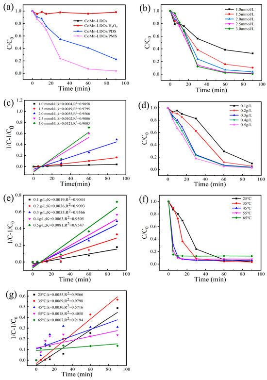 (a) Comparative evaluation of BPA degradation performance across various catalytic systems; (b) Effect of PMS dosage on BPA degradation performance; (c) Pseudo-second-order kinetic fitting curves for BPA degradation under varying PMS dosages; (d) Effect of CoMn-LDO loading on BPA degradation efficiency; (e) Pseudo-second-order kinetic fitting curves of BPA degradation under different CoMn-LDO loadings; (f) Effect of temperature on BPA degradation performance; (g) Pseudo-second-order kinetic fitting curves of BPA degradation at different temperatures (Standard conditions: [PMS] = 2 mmol/L, [CoMn-LDO] = 0.3 g/L, T = 25 °C, pH 7.0, 0.1 L of BPA solution with concentration of 50 mg/L unless otherwise specified).