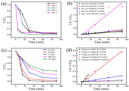 (a) Effect of reaction pH on BPA degradation efficiency; (b) Pseudo-second-order kinetic fitting curves for BPA degradation under different pH conditions; (c) Influence of initial BPA concentration on degradation efficiency; (d) Pseudo-second-order kinetic fitting curves for BPA degradation at different initial concentrations. (Experimental conditions: PMS dosage = 2 mmol/L, CoMn-LDO dosage = 0.3 g/L, T = 35 °C, initial pH = 7, reaction volume = 100 mL of 50 mg/L BPA solution).
