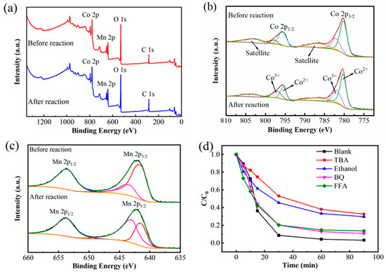 High-resolution XPS measurements of the Co 2p and Mn 2p core levels are, respectively, displayed in Figure 9b,c, providing insights into the metal oxidation states. Before the reaction, the Co 2p spectrum (Figure 9b) displayed two major peaks at 795.7 eV (Co 2p1/2) and 780.2 eV (Co 2p3/2), along with satellite peaks at 786.5 eV and 803.2 eV, indicating the dominant presence of Co2+ [30]. After the reaction, the binding energies of the two main peaks slightly shifted to 795.4 eV and 780.5 eV. Conversely, the peak area representing Co3+ (781.9 eV and 797.1 eV) increased significantly, indicating an increase in Co3+ content after the reaction [31]. Similarly, the Mn 2p spectrum (Figure 9c) before the reaction contained characteristic peaks for Mn 2p1/2 (653.5 eV) and Mn 2p3/2, which were further resolved into two components at 641.6 eV (Mn3+) and 643.40 eV (Mn4+) [32], confirming Mn3+ as the dominant oxidation state. Post-reaction, the Mn 2p1/2 peak shifted to 653.8 eV, while the Mn 2p3/2 peaks shifted to 641.5 eV (Mn3+) and 643.0 eV (Mn4+), indicating an increase in Mn4+ content.