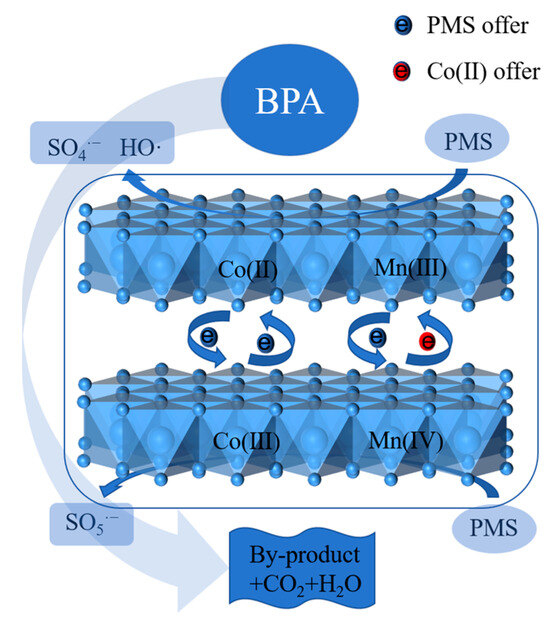 Building upon the XPS analysis and radical trapping experiments, a schematic illustration of the proposed catalytic mechanism for BPA degradation in the CoMn-LDO/PMS system is presented in Figure 10. The redox cycling between Co2+/Co3+ and Mn3+/Mn4+ facilitates the continuous activation of PMS to generate reactive radicals, with ·OH playing the dominant role in the oxidative degradation of BPA molecules. BPA produces by-products such as phenylethanol, p-isopropylphenol, phenol, benzoquinone, benzaldehyde, styrene, hydroxyphenylethanone, p-ethylstyrene, and 4-isopropylphenol under the attack of SO4·− and ·OH, and the formed by-products were further mineralized into CO2 and H2O [9,33]. The specific reaction equations involved are as follows:
