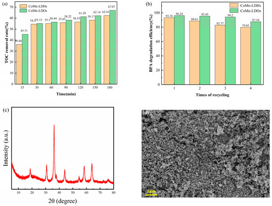 (a) TOC removal and (b) recycling performance. (Conditions: [PMS] = 2 mmol/L, [catalyst] = 0.3 g/L, T = 35 °C, pHinitial = 7, 100 mL of 50 mg/L BPA solution). (c) XRD and (d) SEM images of CoMn-LDO after cyclic testing.
