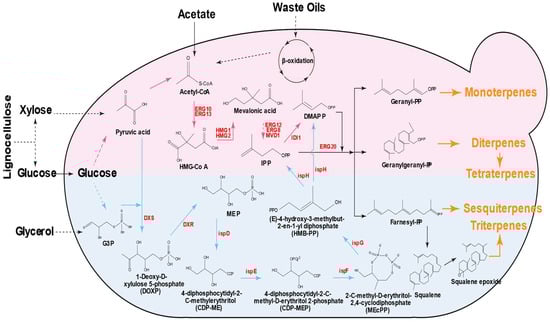The biosynthesis of terpenoids in microbes involves two distinct pathways: the mevalonate (MVA) pathway in eukaryotes, and the methyl-D-erythritol-4-phosphate (MEP) pathway in prokaryotes [8,13]. The MVA pathway primarily occurs in the cytoplasm, starting with acetyl-CoA as the initial substrate and generating isopentenyl pyrophosphate (IPP) and dimethylallyl pyrophosphate (DMAPP) through multiple enzymatic steps (Figure 1). The key rate-limiting enzyme of the MVA pathway is 3-hydroxy-3-methylglutaryl-CoA reductase (HMGR), which catalyzes the conversion of HMG-CoA to MVA [14]. The MEP pathway starts with pyruvate and glyceraldehyde-3-phosphate (G3P), with methylerythritol-4-phosphate (MEP) as the key intermediate converted to IPP and DMAPP (Figure 1). The key rate-limiting enzymes of the MEP pathway are 1-deoxy-D-xylulose-5-phosphate synthase (DXS) and reductoisomerase (DXR), catalyzing the first two steps in the pathway [15]. There are many natural microorganisms that can synthesize terpenoids, including bacteria, yeast, and filamentous fungi [15,16,17]. In current terpenoid biosynthesis research and industrial practices, filamentous fungi are not commonly used as engineered hosts for terpenoid production, because they often suffer from limitations such as complex genetic manipulation and long culture cycles, which make their application far less widespread than that of yeast and bacterial systems [17,18]. Thus, the most widely studied and practically applicable microbial hosts are yeast and bacteria, such as Saccharomyces cerevisiae, Yarrowia lipolytica, Ogataea polymorpha, Escherichia coli, Bacillus spp., and so on [15,19,20]. These systems are preferred for terpenoid production due to their clear genetic backgrounds, established genetic manipulation tools, rapid growth, and controllable metabolic flux. A growing number of terpenoids have already been successfully synthesized via construction of various microbial cell factories, including artemisinic acid, valencene, β-carotene, limonene, farnesene, and squalene [21,22,23,24,25,26].