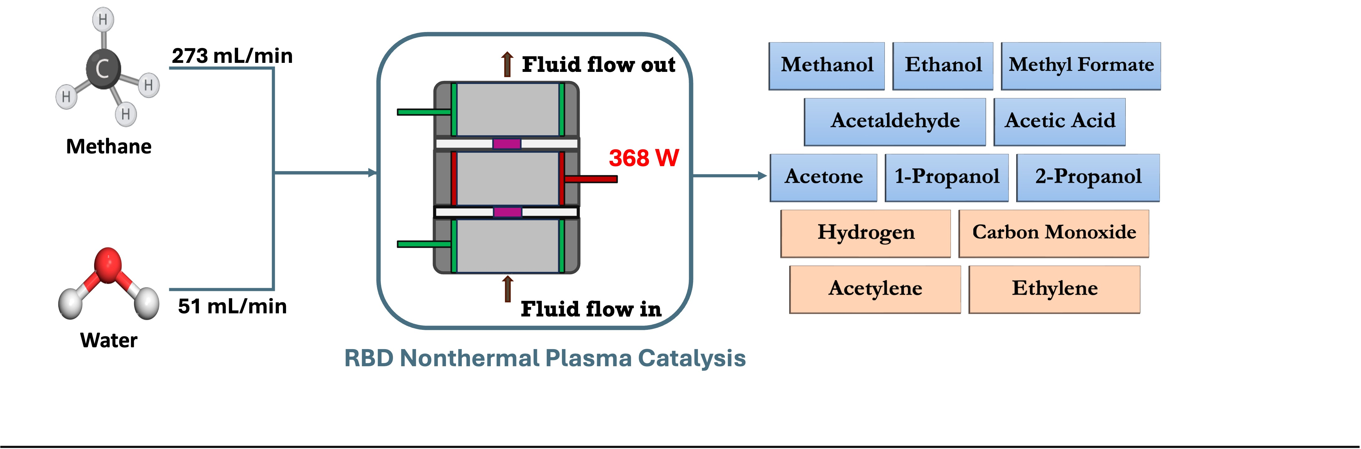- Ekow, A.-O.; Ahmad, M.; Sarah, W. Plasma-enabled methane upgrading in a gas-liquid reactor: Optimizing a one-step methanol production process. J. Ind. Eng. Chem. 2025, 151, 682–691. [Google Scholar]