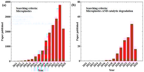The number of papers published each year in the past 15 years related to (a) microplastics in general and (b) the catalytic degradation of microplastics. Source: Web of Science. Data was collected on 19 August 2025. The search criteria are listed in the plot.