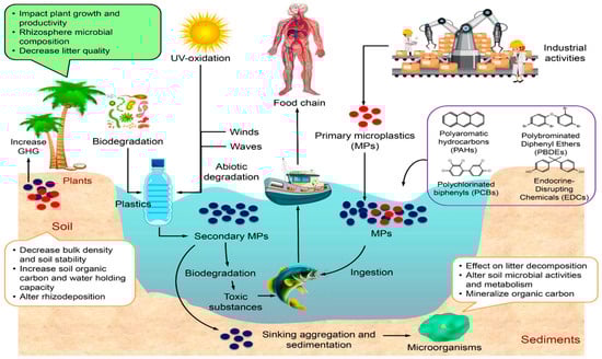 A life cycle demonstration of MPs, including the formation of primary and secondary MPs and the adverse effects of their formation on aquatic flora and humans through the food chain [16].