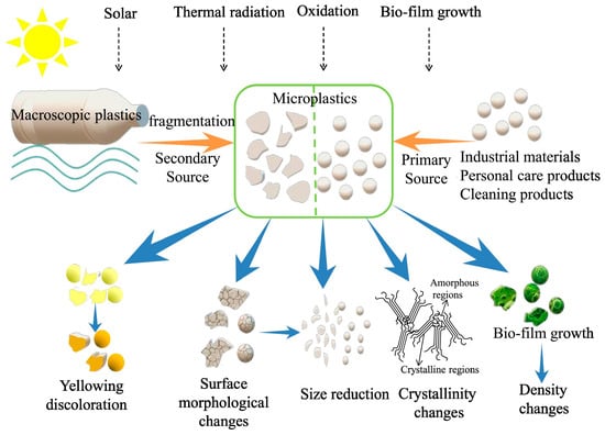 Besides the size, the second difference of MPs is their complexity, both in physical and chemical properties. MPs can originate from numerous sources and are usually treated as heterogeneous materials, including synthetic clothing, microbeads, and the breakdown of larger plastic items. Their variation in size, shape, density, and chemical composition makes their studies complicated not only in detection but also in the development of removal methodologies. In a work on MP identification on beaches in Plymouth, UK, by Richard Thompson et al. [1], eight polymers were identified, including acrylic, alkyd, polyethylene, polypropylene, polyamide, polyester, polymethylacrylate, and polyvinyl alcohol, indicating that the MPs come from different bulk plastic sources. Furthermore, for the origin of MP toxicity, it can be a result of the plastic chemicals or the particle itself, while different MPs can show significant differences in toxicity. According to the work by Lisa Zimmermann et al. [28], the authors show that chemicals in plastics contribute more to toxicity in the case of polyvinyl chloride (PVC), but not in the case of polyurethane (PUR) and polylactic acid (PLA) plastics. Interestingly, they observed that bioplastics show similar toxicity to their conventional plastic counterparts. Therefore, treating MPs as a homogeneous entity is not suitable for environmental impact assessment. Instead, the chemical compositions and physical conditions of different MPs should be considered. Therefore, it will be much more challenging to develop efficient catalysts for the heterogeneous MPs treatment compared to their bulk counterparts. For a better view, the property changes of macroplastics to MPs after degradation are summarized and shown in Figure 3. A detailed property comparison between bulk plastic and MPs is also provided in Table 2.