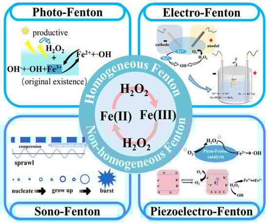 Mechanism: The Fenton reaction involves the reaction of Fe2+ with H2O2 to produce ·OH, which are strong oxidizers, and ferric iron (Fe3+). Fe3+ is then reduced back to Fe2+ by another molecule of H2O2, creating a chain reaction, as shown in Equations (1) and (2). The overall effect is the generation of ·OH, which are highly reactive and capable of oxidizing and degrading organic pollutants [74], while for Fenton-like reactions, different metal catalysts, ligands, or peroxides operating under modified conditions, such as different pH levels or the application of light or electricity, can be applied, leading to variations in the reaction mechanism and the production of various ROS. The Fenton/Fenton-like reaction belongs to one type of AOP. In Fenton/Fenton-like oxidation systems, multivalent metals, such as Fe, Cu, Co, Mn, Ce, Ag, Cr, Ru, W, Mo, V, Ti, etc., are commonly applied as catalysts that can activate H2O2 and generate ROS. The mechanism is through changes of low-valent metal (Mn+) with reduction properties and high-valent metal (M(n+z)+) with oxidation properties due to the reductant and oxidant properties of H2O2. Besides H2O2, organic peroxides (ROOH) or peroxydisulfate (S2O82−) and persulfate (HSO5−) can also be used. Fenton/Fenton-like reactions can be carried out in homogeneous and non-homogeneous systems, while in terms of the driving force used, photo-, electrically, ultrasonically, and piezoelectrically triggered Fenton reactions can be divided as shown in Figure 6. For detailed information on Fenton and Fenton-like reactions, including mechanisms, application systems, and materials, review papers [75,76,77] can provide ample information.