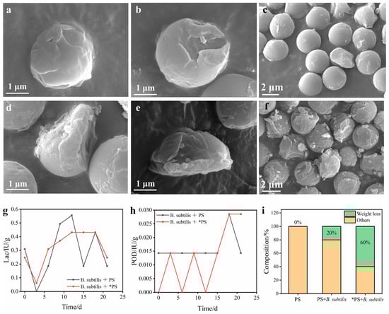 (a–c) SEM images of PS degradation using B. subtilis soil for 24 days. (d–f) SEM images of PS degradation through Fenton reaction pretreatment and B. subtilis for 24 days. Enzyme activity of (g) laccase and (h) peroxidase concentrations using different catalyst combinations and (i) weight loss of PS using different catalyst combinations (*PS indicates Fenton reaction-pretreated PS) [109].