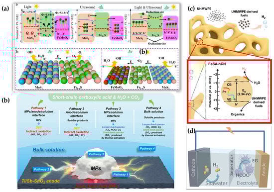 In Miao et al.’s work [122], an innovative electro-Fenton-like (EF-like) technology is designed to degrade PVC MPs in an aqueous environment by employing a TiO2/graphite (TiO2/C) cathode. The system can simultaneously promote cathodic reductive dechlorination and ·OH oxidation, enabling effective degradation. Using the idea of process intensification and fabricating heterogeneous materials to modulate the interfacial electronic structure, ternary heterogeneous interpenetrating catalysts, Fe1−xS/FeMoO4/MoS2 (Mo5Fe5), are also prepared to enhance MP degradation through a piezo-photocatalytic approach [123]. Under sonication and simulated light conditions, 58.46% of PS-MPs can be degraded in 30 h. The superior performance is due to the ternary heterogeneous structure, where piezoelectric response and illumination both favor the generation of H2O2, leading to the rapid activation of ROS for MP degradation.