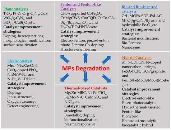 MP degradation includes transforming MPs into smaller molecules that are less harmful or useful components, such as CO2 [47], light hydrocarbons [48], carbon-based materials for catalyst preparation [49], fuel, chemicals [50], etc. Under natural environmental conditions, the MP degradation process is slow and results in a loss of carbon stock due to its persistent nature and a lack of reaction control. To mitigate the challenges and potentially turn wasted MPs into valuable feedstock in the carbon cycle, catalysts play a vital role in speeding up the degradation process and controlling the reaction direction. In the review, depending on the working mechanism and materials type used, catalysts for MP degradation are divided into photocatalysts, Fenton and Fenton-like catalysts, thermochemical catalysts, bio and bio-inspired catalysts, electrocatalysts, and hybrid catalysts, aiming to provide a clear and systematic overview of currently applied MP catalysts. Based on the category, novel catalyst design and engineering methods used to achieve improved MP degradation will be summarized and discussed based on the most recent publications.