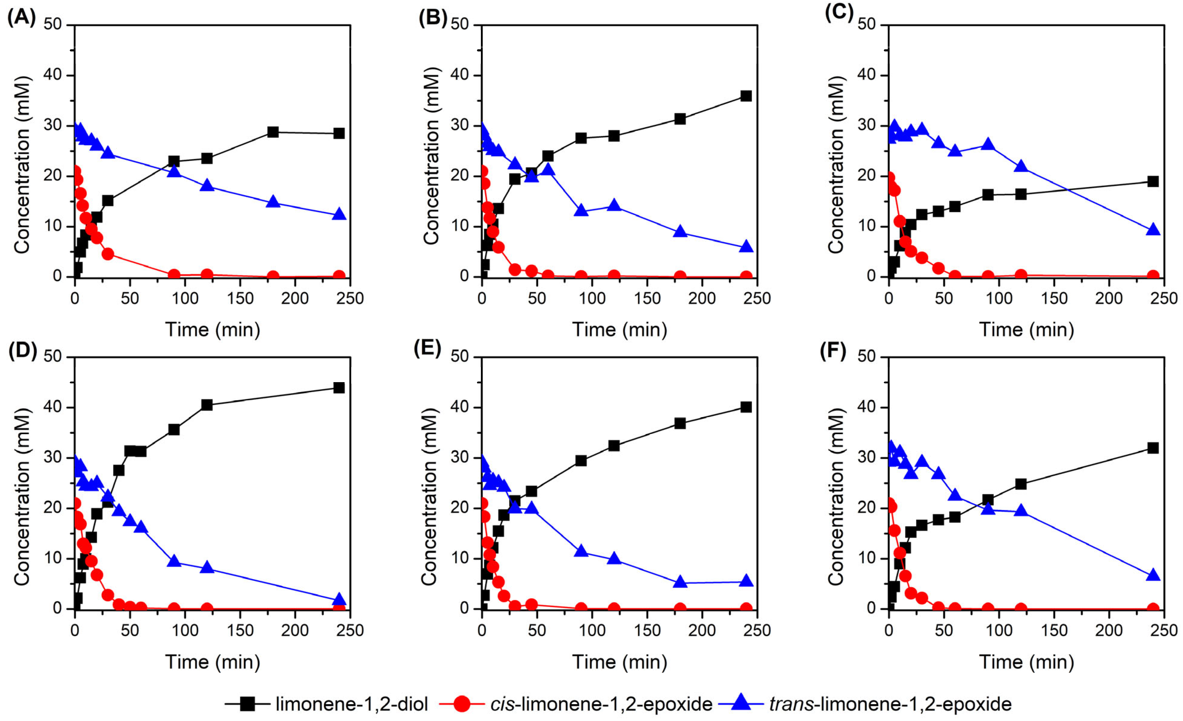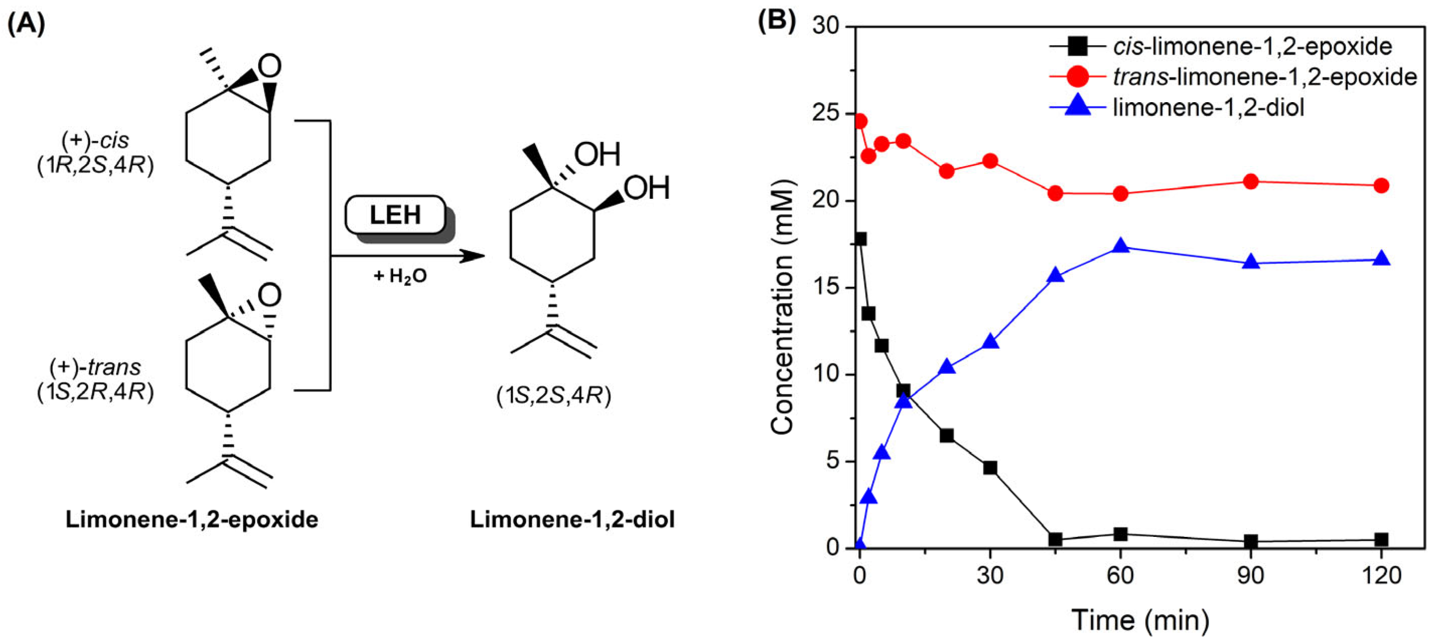 - van der Werf, M.J.; Orru, R.V.A.; Overkamp, K.M.; Swarts, H.J.; Osprian, I.; Steinreiber, A.; de Bont, J.A.M.; Faber, K. Substrate specificity and stereospecificity of limonene-1,2-epoxide hydrolase from Rhodococcus erythropolis DCL14; an enzyme showing sequential and enantioconvergent substrate conversion. Appl. Microbiol. Biotechnol. 1999, 52, 380–385. [Google Scholar] [CrossRef]