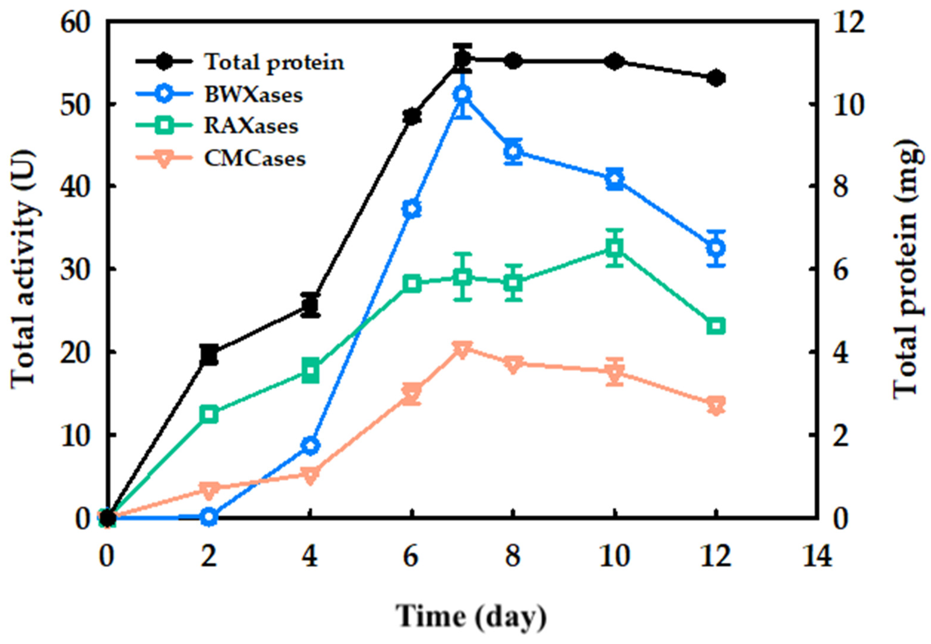 - Saha, B.C. Production, purification and properties of xylanase from a newly isolated Fusarium proliferatum. Process Biochem. 2002, 37, 1279–1284. [Google Scholar] [CrossRef]