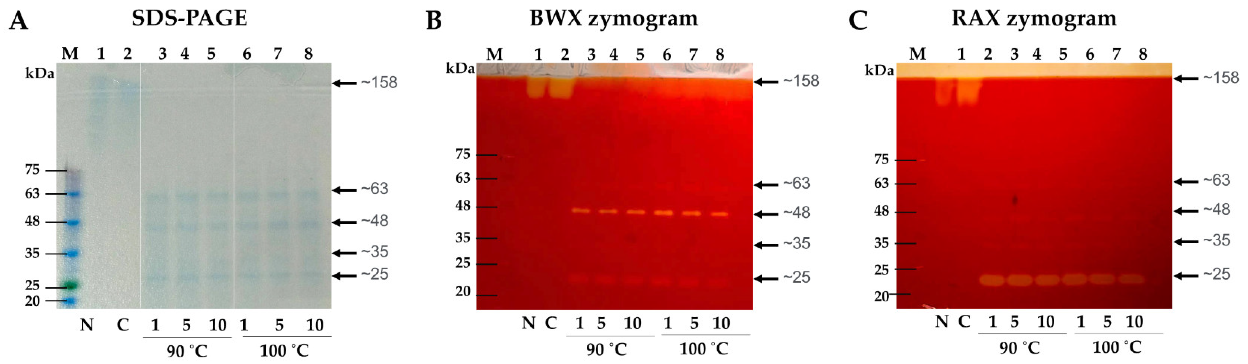 - Heinen, P.R.; Henn, C.; Peralta, R.M.; Bracht, A.; Simão, R.D.; da Conceição Silva, J.L.; Polizeli, M.D.; Kadowaki, M.K. Xylanase from Fusarium heterosporum: Properties and influence of thiol compounds on xylanase activity. Afr. J. Biotechnol. 2014, 13, 1047–1055. [Google Scholar] [CrossRef]