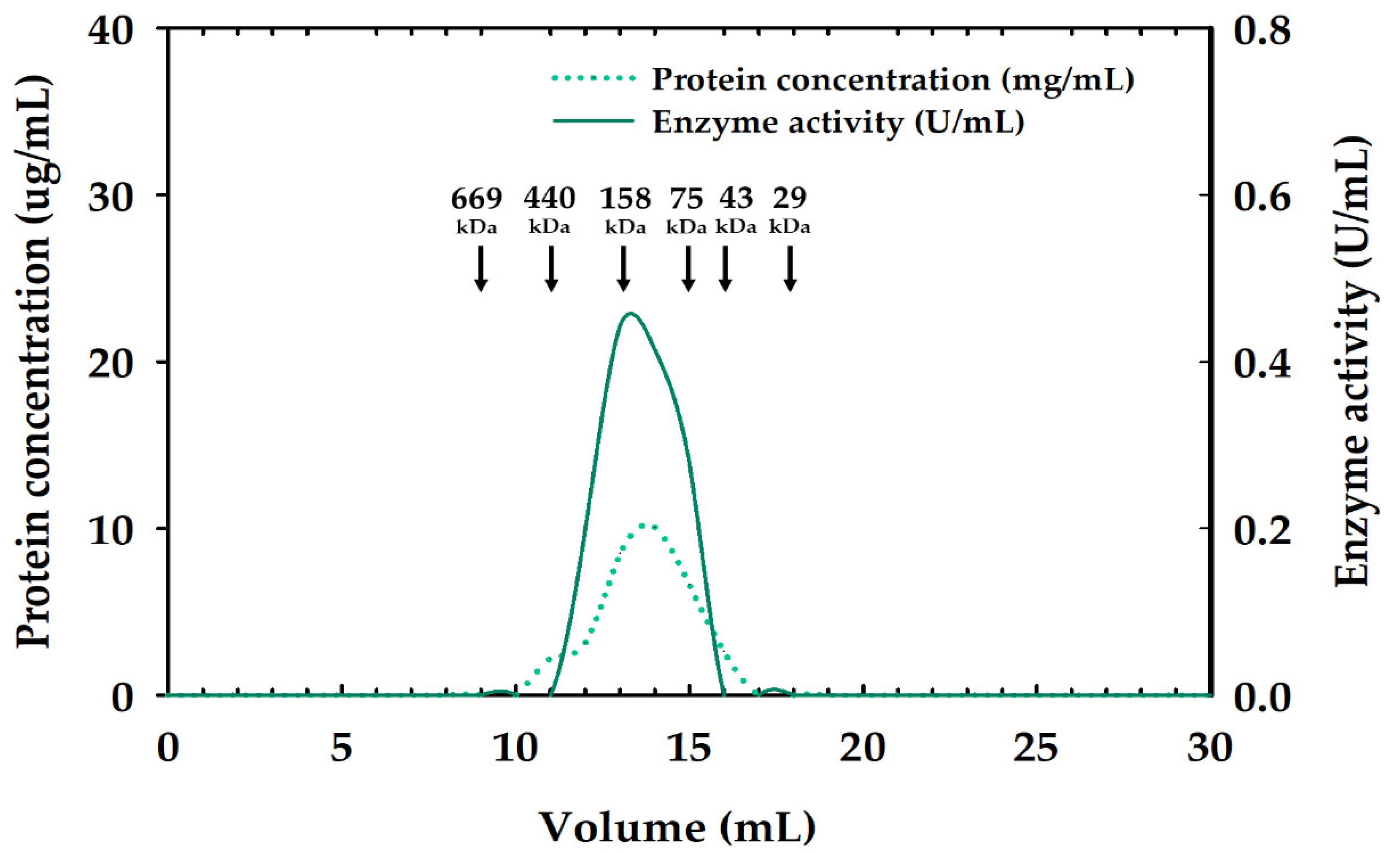(NH4)2SO4 precipitation | 45 | 0.74 ± 0.01 | 9.15 ± 0.40 | 33.46 ± 0.44 | 411.84 ± 18.15 | 12.37 ± 0.55 | 44.90 | 1.33 |