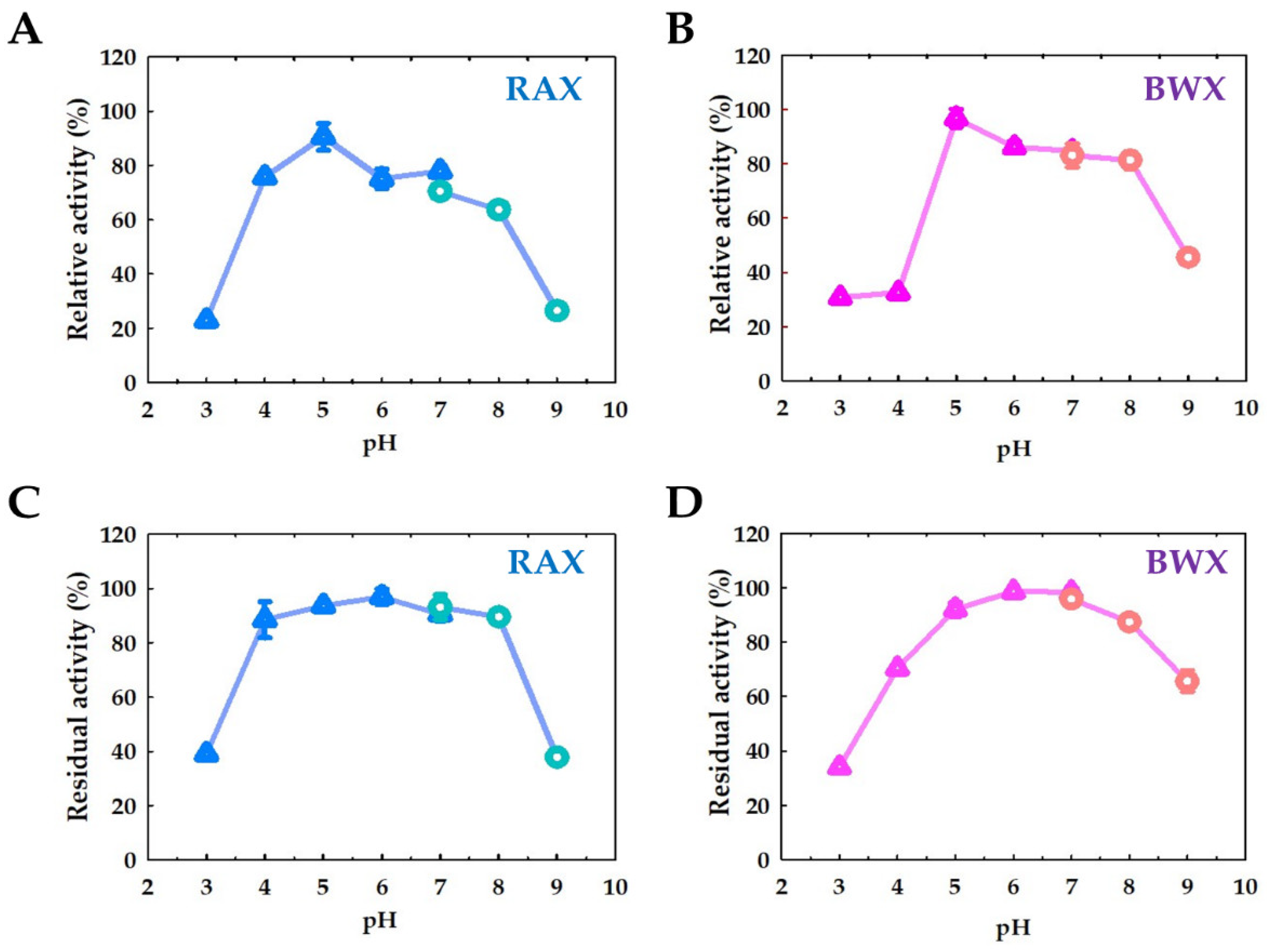 2.5.1. Effect of pH on Xylanase Activity and Stability
