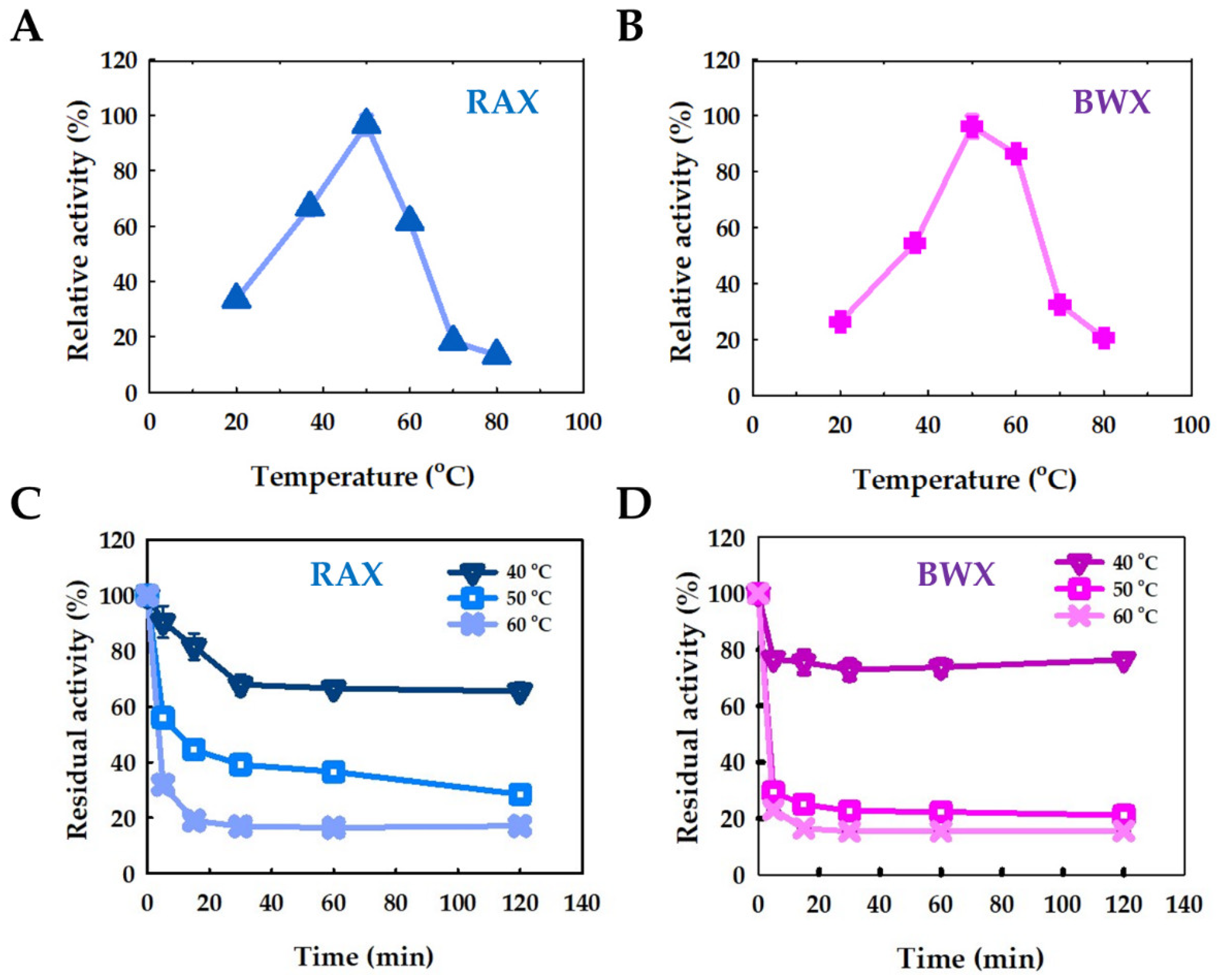 2.5.2. Effect of Temperature on Xylanase Activity and Stability