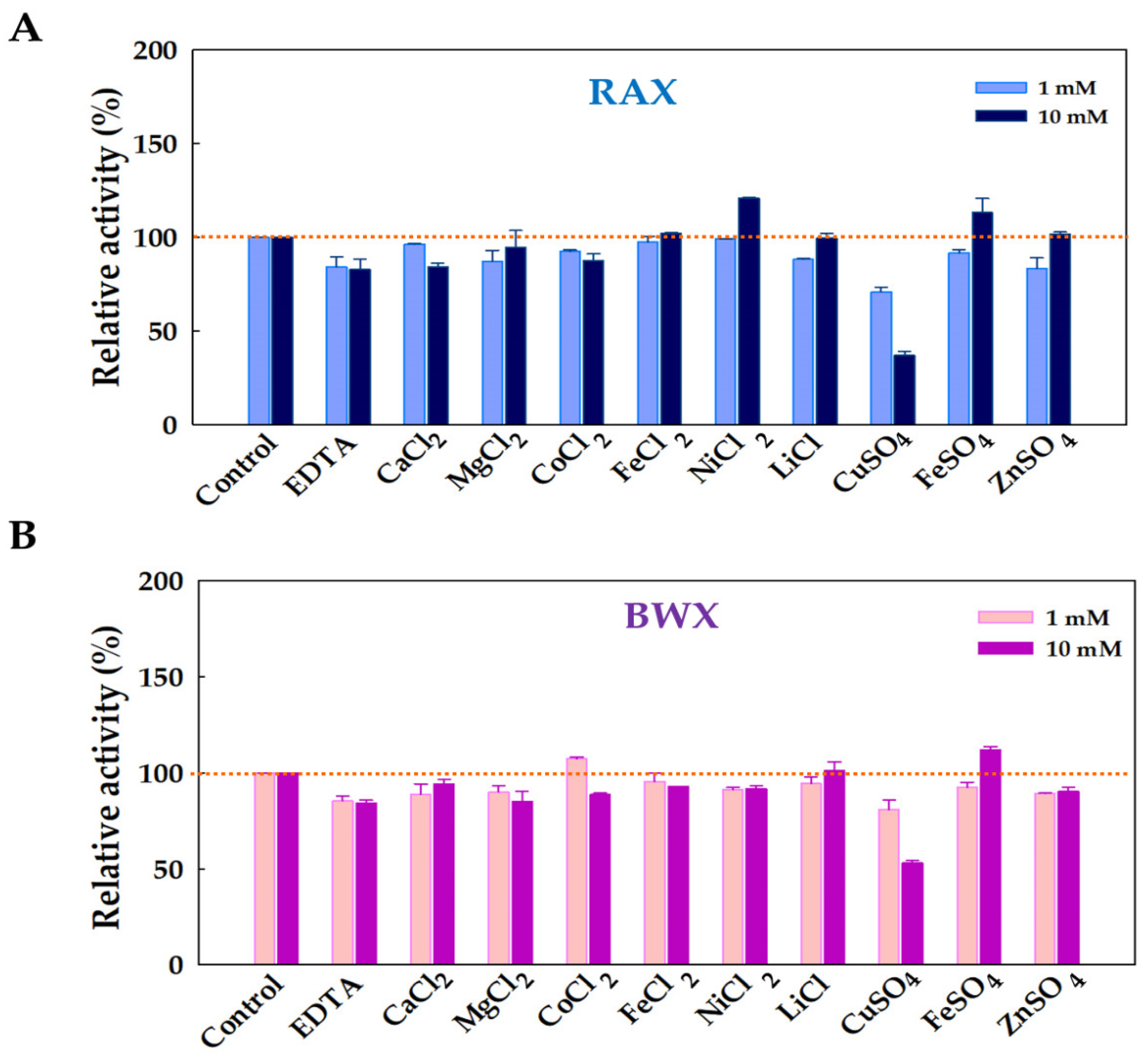 2.5.3. Effect of Metal Ions and Chemical Reagents on Xylanase Activity