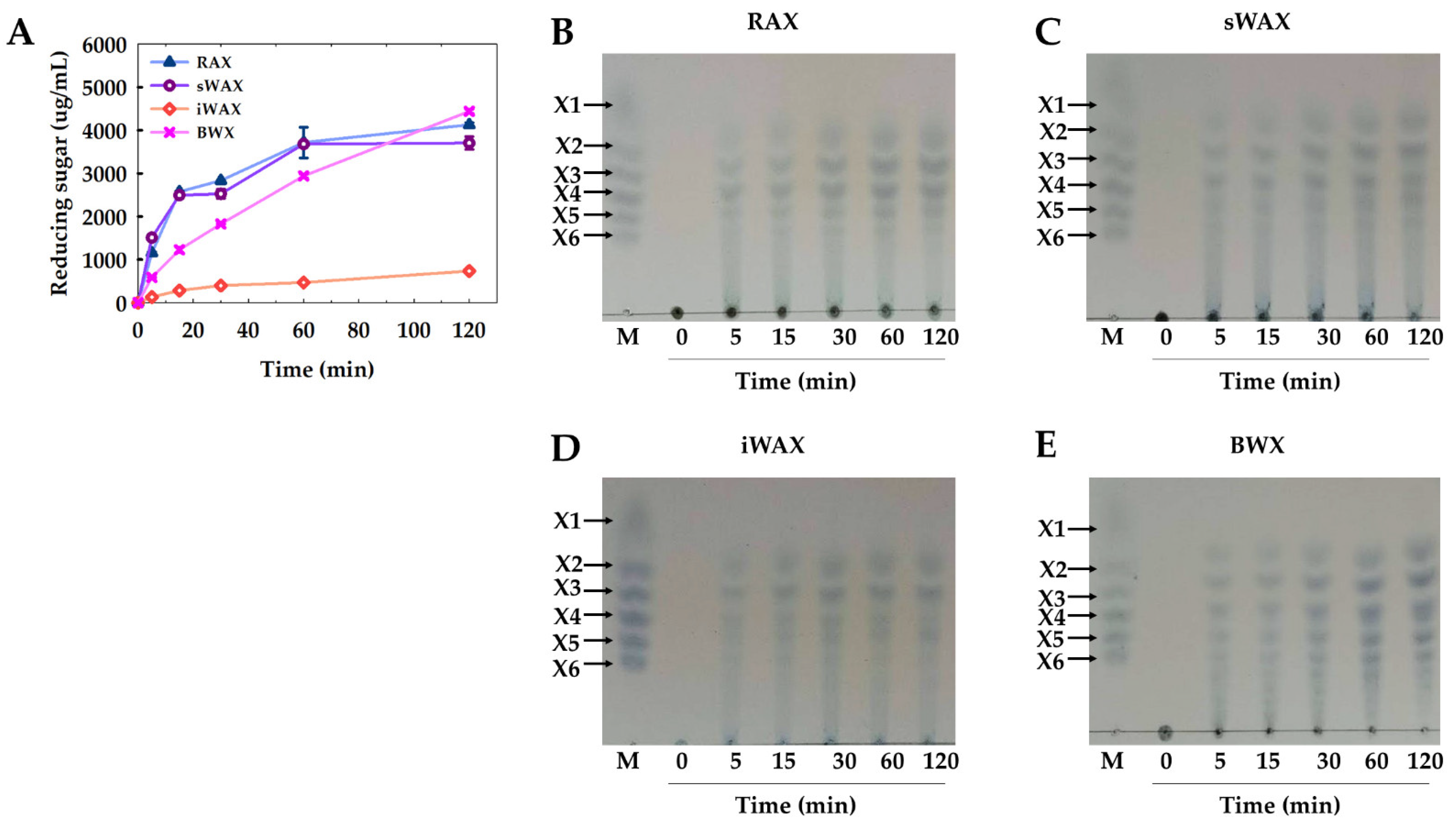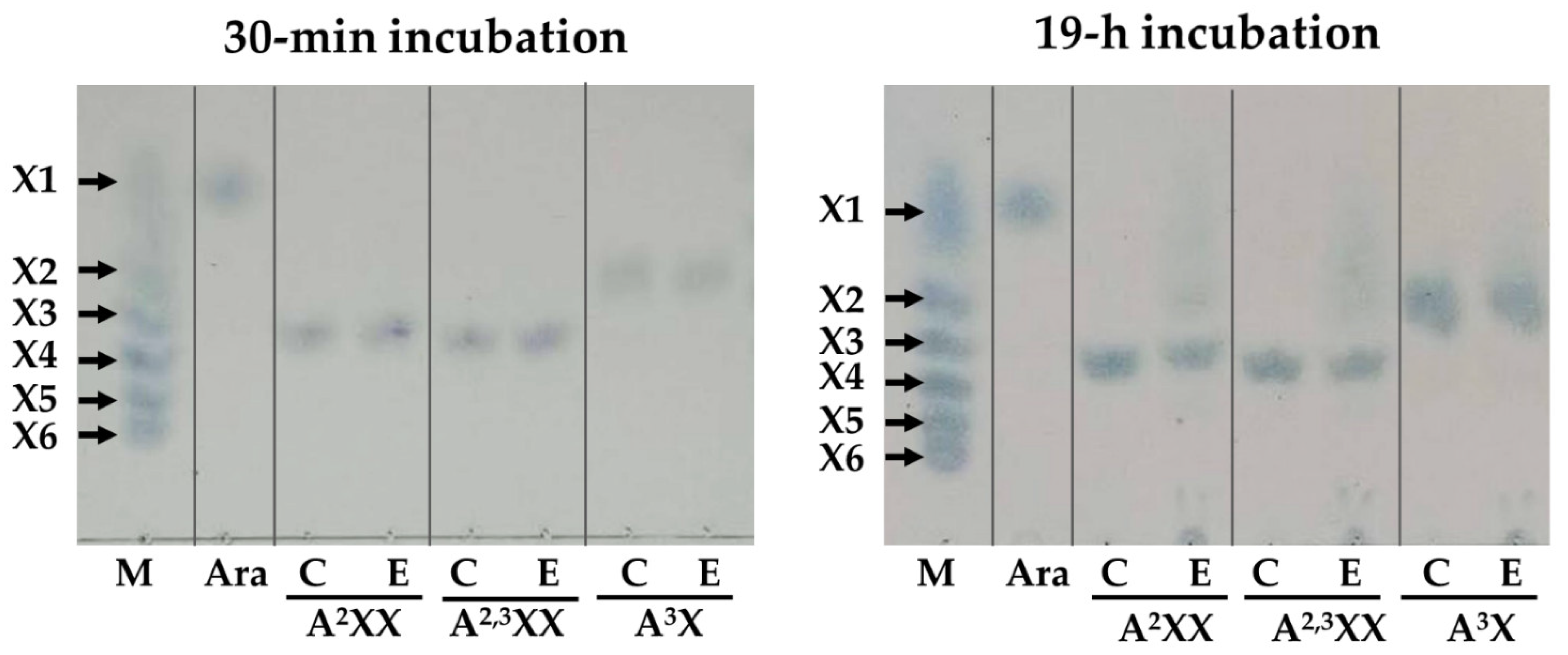 - Pauchet, Y.; Ruprecht, C.; Pfrengle, F. Analyzing the Substrate Specificity of a Class of Long-Horned-Beetle-Derived Xylanases by Using Synthetic Arabinoxylan Oligo- and Polysaccharides. ChemBioChem 2020, 21, 1517–1525. [Google Scholar] [CrossRef]