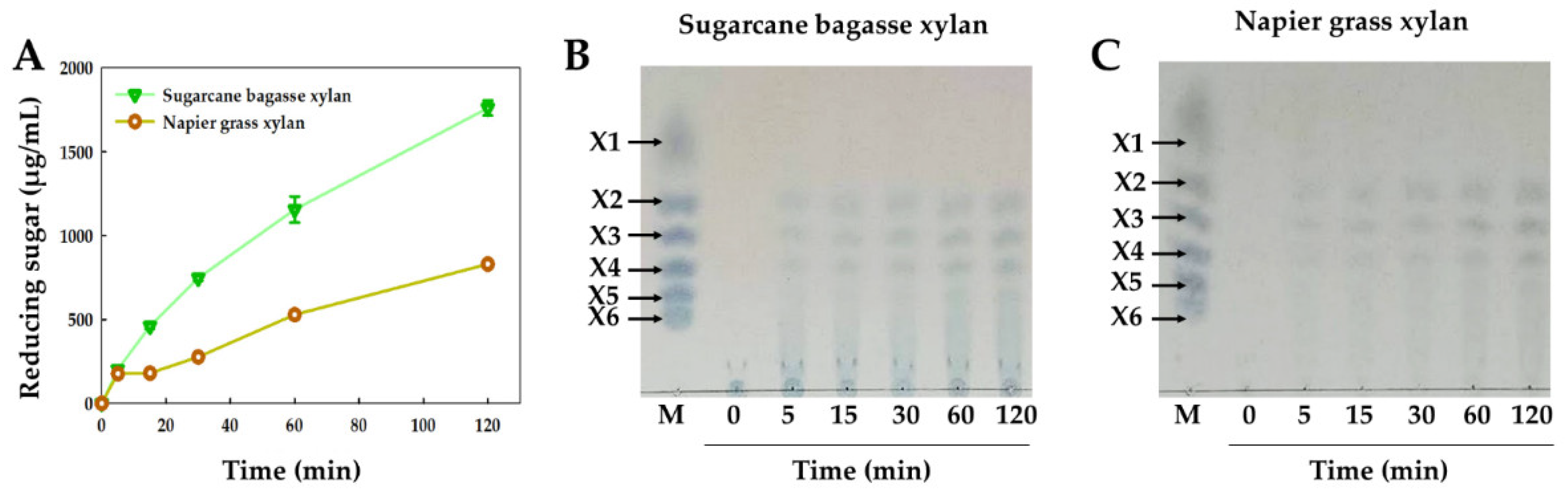 - Phitsuwan, P.; Morag, E.; Tachaapaikoon, C.; Pason, P.; Kosugi, A.; Ratanakhanokchai, K. Behavior and supportive evidence of a large xylanase-containing multienzyme complex of tepidimicrobium xylanilyticum bt14. BioResources 2012, 7, 5934–5949. [Google Scholar] [CrossRef]