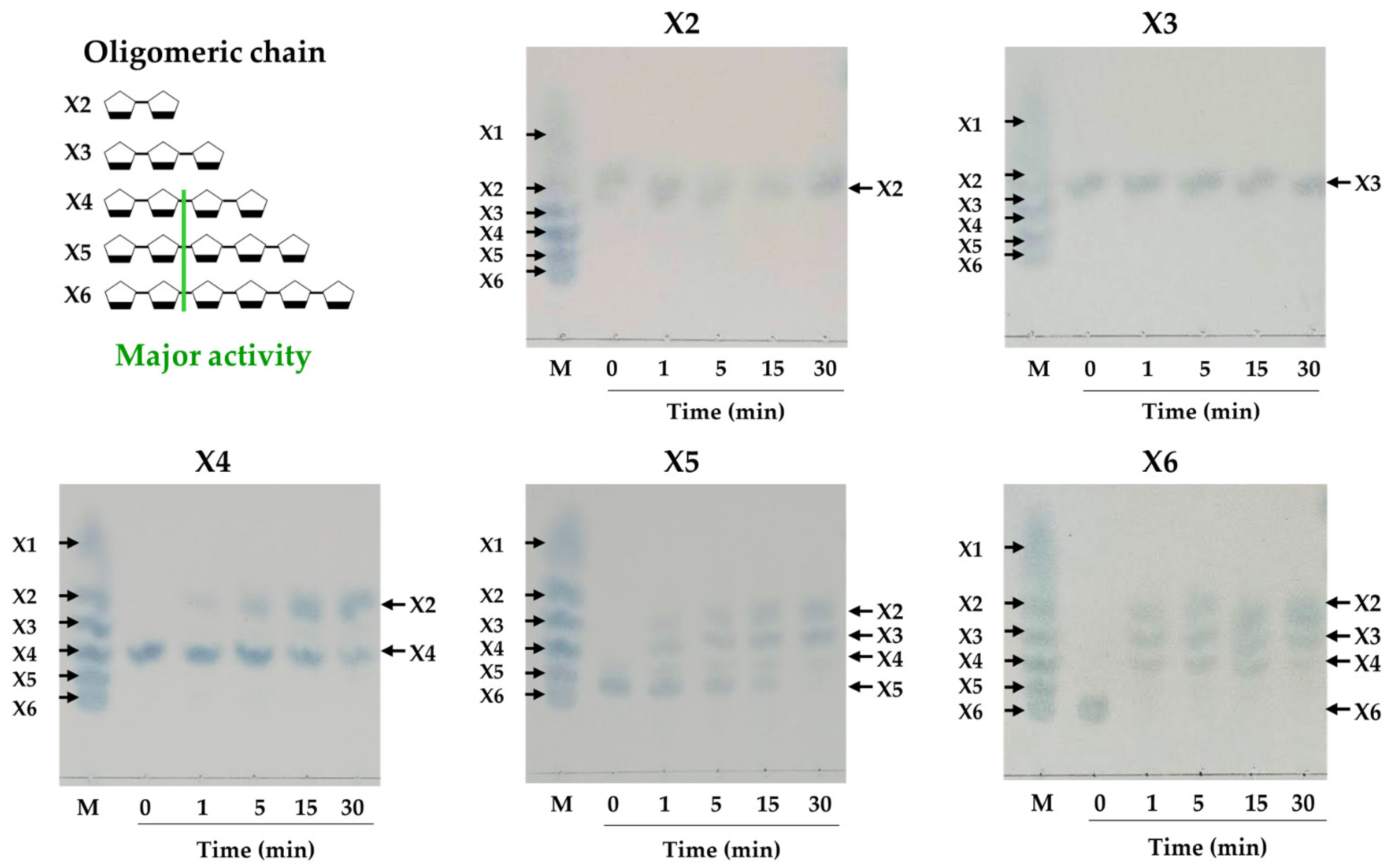 - Heinen, P.R.; Bauermeister, A.; Ribeiro, L.F.; Messias, J.M.; Almeida, P.Z.; Moraes, L.A.B.; Vargas-Rechia, C.G.; de Oliveira, A.H.C.; Ward, R.J.; Filho, E.X.F.; et al. GH11 xylanase from Aspergillus tamarii Kita: Purification by one-step chromatography and xylooligosaccharides hydrolysis monitored in real-time by mass spectrometry. Int. J. Biol. Macromol. 2018, 108, 291–299. [Google Scholar] [CrossRef]