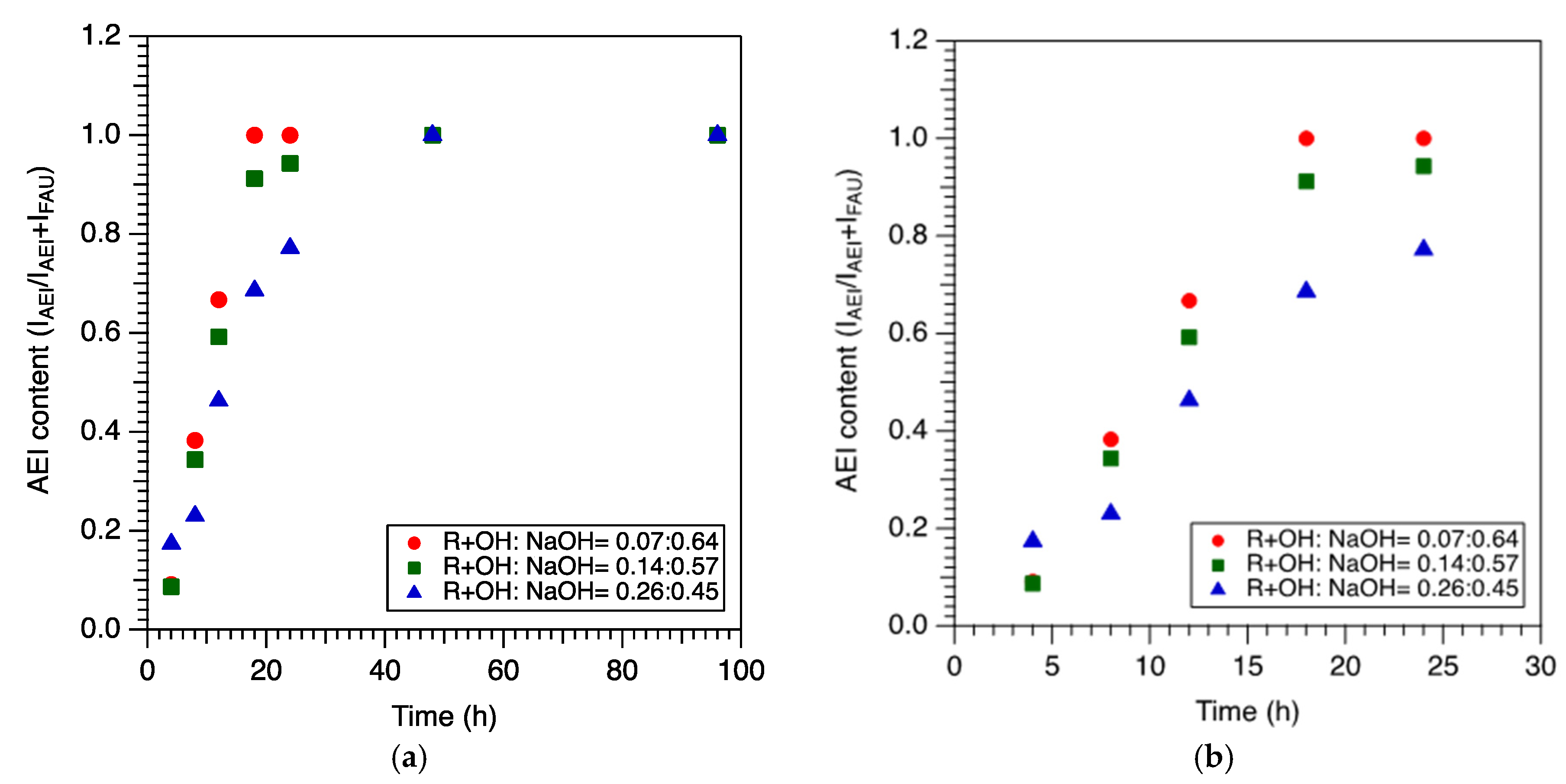 - Tsunoji, N.; Shimono, D.; Tsuchiya, K.; Sadakane, M.; Sano, T. Formation Pathway of AEI Zeolites as a Basis for a Streamlined Synthesis. Chem. Mater. 2020, 32, 60–74. [Google Scholar] [CrossRef]