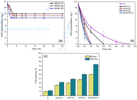 (a) Adsorption and (b) removal rate of NPX in the presence of the NiFeF (varying the size of the piece). (c) TOC removal of NPX in different systems. Experimental conditions: [O3] = 11 mg L−1, catalyst dosage = 1 piece, [NPX] = 20 mg L−1.