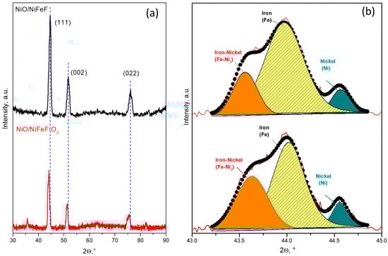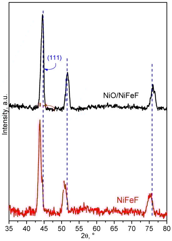 The X-ray diffraction (XRD) patterns of NiFeF and NiO/NiFeF composite are shown in Figure 2. The pristine NiFeF sample exhibited characteristic peaks at 43.7°, 50.6° and 74.9° corresponding to the (111), (200), and (220) planes of bulk FeNi alloy, in agreement with JCPDS card 96-901-1507. Additionally, a distinct peak at 44.5° is assigned to the (110) planes of body-centered cubic (BCC) iron, according to JCPDS No. 987-018-5729. Other expected Fe-related reflections were not observed, likely due to low crystallinity or peak overlap (see Figure S1). It is worth noting that NiFeF is a Ni–Fe alloy with a higher nickel content than iron, which explains the greater intensity of Ni-related peaks [33].