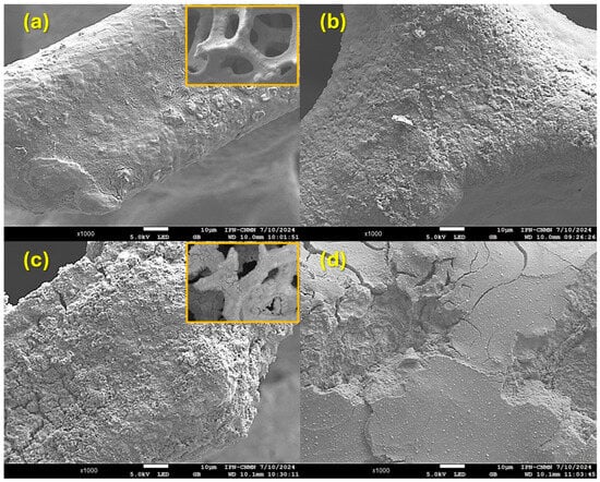 The surface morphology of the materials was analyzed using SEM. As shown in the insert of Figure 4a, the pristine NiFeF exhibits a three-dimensional porous network with an interconnected structure and relatively smooth surfaces. After exposure to ozone (Figure 4b), the NiFeF surface appears rougher, with the presence of small particles and irregular granules.