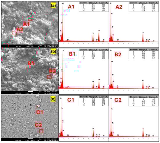 The elemental composition and distribution of Ni, Fe, and O were examined by EDS, as presented in Figure 5a–c. Elemental mapping was performed in two different regions (A1 and A2) of each sample to assess the homogeneity of the surface composition. In pristine NiFeF (Figure 5a), mapping revealed a pronounced variation in Ni content, with 67 wt% in region A1 and 13.4 wt% in region A2, indicating an inhomogeneous surface distribution. This variability likely reflects local compositional or structural features, such as Ni enrichment, porosity, or uneven surface coverage.