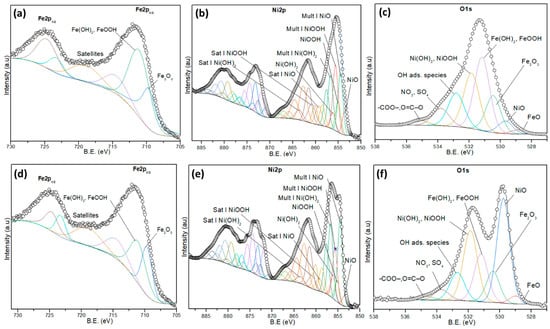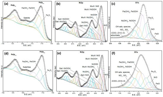 As shown in Figure 7c,f, the O1s spectra show several contributions. The peaks at 528.5–530.2 eV correspond to lattice oxygen in NiO and Fe2O3, while the peaks at 531.2–531.9 eV can be ascribed to hydroxyl species (Ni(OH)2, FeOOH), and the peak at 532.8 eV is attributed to adsorbed OH groups. Additional peaks in the range 532.5–535.2 eV are ascribed to surface-adsorbed oxygenated species, including -COO−, O=C–O−, NO3− and SO42−, Table S7.