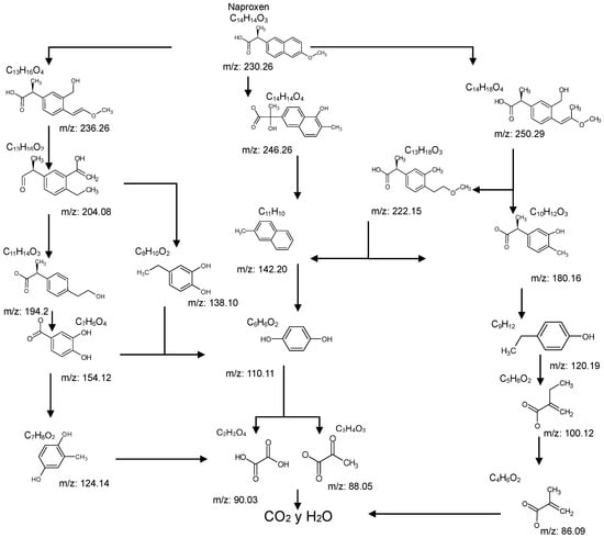 Among ECs, pharmaceutical compounds are of particular concern due to their widespread use in maintaining animal and human health. The pharmaceutical industry produces significant quantities of toxic effluents that are often discharged through hospital wastewater, manufacturing plants, and domestic sewage systems [2,3]. In particular, naproxen (NPX), a nonsteroidal anti-inflammatory drug (NSAID) with analgesic, antipyretic and anti-inflammatory properties, has been detected in surface waters across several Latin American countries (e.g., Brazil, Venezuela, Argentina, Colombia, Ecuador) [4,5]. In many cases, its concentration exceeds the predicted no-effect concentration (PNEC) of 0.15 mg L−1 for human health as defined by the U. S. Environmental Protection Agency (EPA) and the Committee for Medicinal Products for Human Use (CHMP) [6].