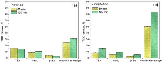 NaN3 addition also reduced TOC removal efficiencies by 3.0- and 7.8-fold, indicating the involvement of 1O2. The average TOC removal efficiencies decreased to 90.2% (NiFeF-S1) and 87.2% (NiO/NiFeF-S1) after 120 min. This agrees with previous reports of 1O2 generation during catalytic ozonation [45]. The dual reactivity of NaN3 with both 1O2 and •OH (k•OH = 1.2 × 109 M−1 s−1) [46]. may also partially account for the observed inhibition.