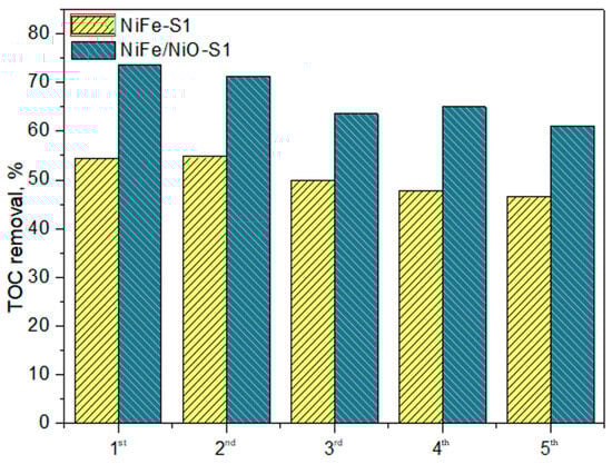 Catalyst stability during NPX ozonation is a critical parameter, evaluated through five consecutive reuse cycles. Figure 11 shows that TOC removal decreased slightly after each run. In the fifth cycle, TOC removal was reduced by only 12.4%. This slight loss of catalytic activity may be due to changes in the oxidation state of the metals in the catalyst (as confirmed by XPS analysis), as well as the partial adsorption of intermediates on the catalyst surface. Therefore, the NiO/NiFeF-S1 catalyst demonstrates good stability and is suitable for long-term use. In the case of NiFeF-S1, it also exhibited high stability, with TOC removal remaining below 10% throughout five successive reuse cycles.