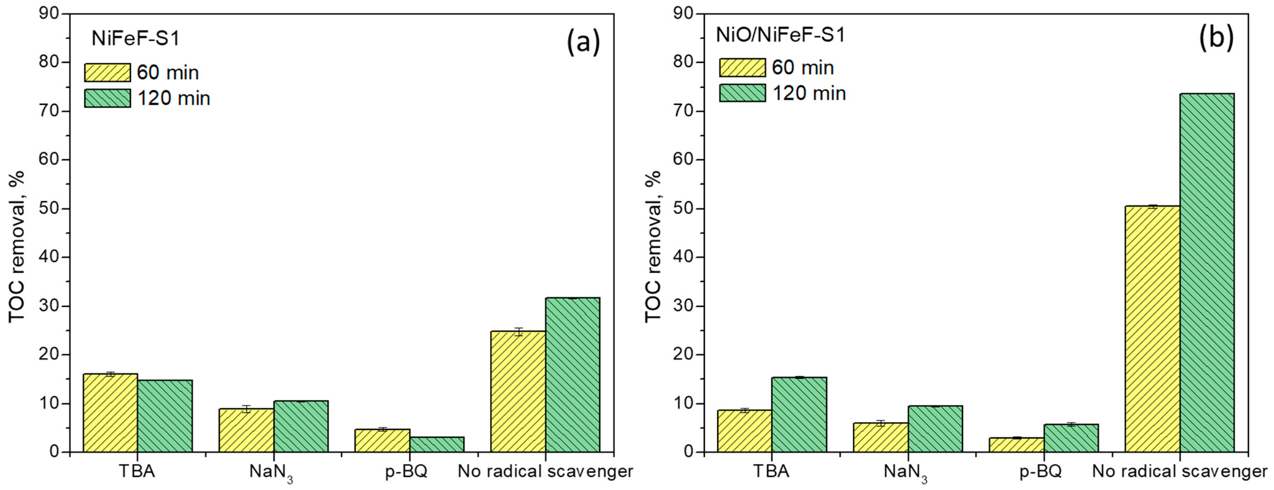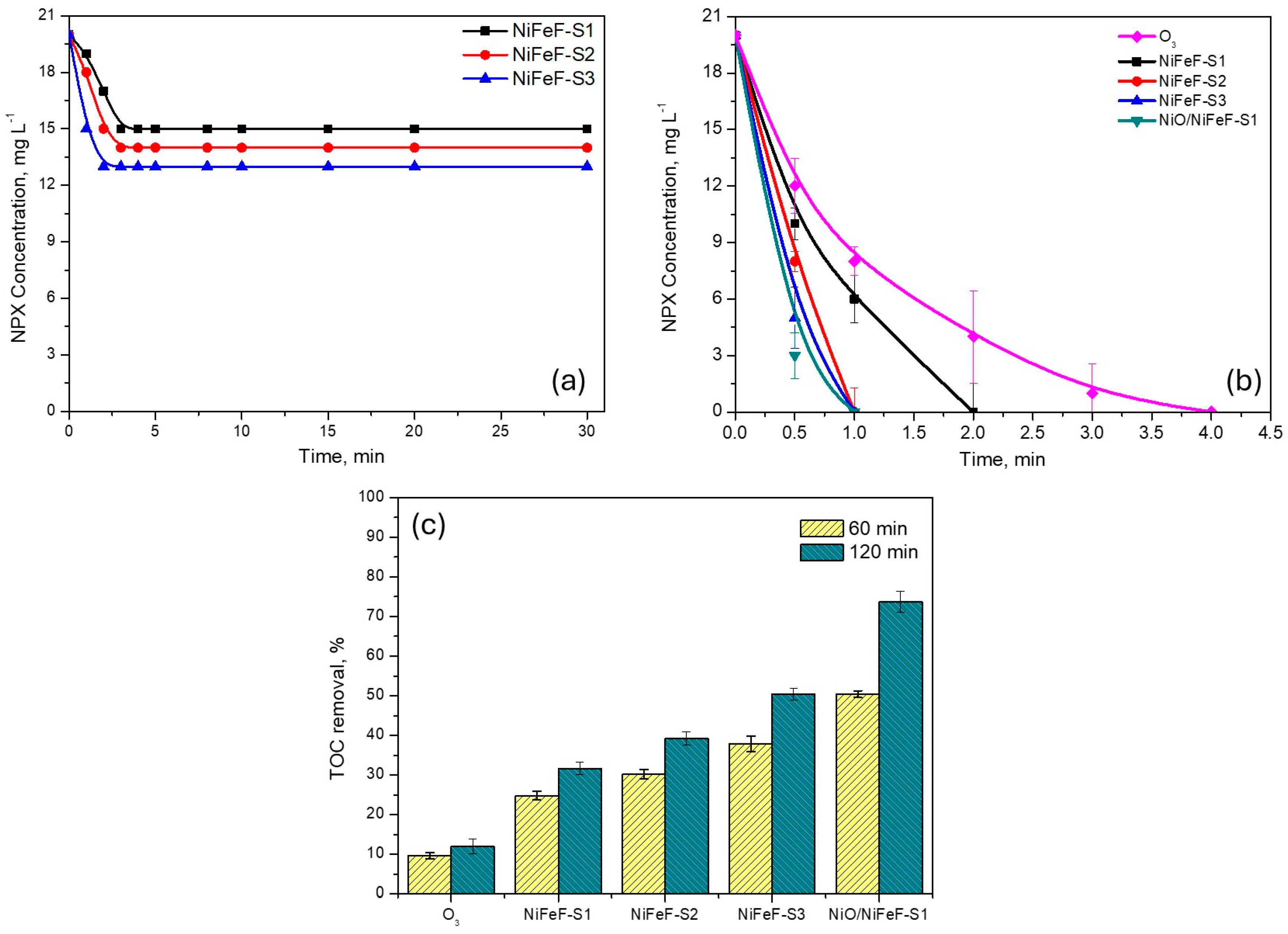 2.1. Evaluation of the Catalytic Activity of NiFeF and NiO/NiFeF in NPX Ozonation