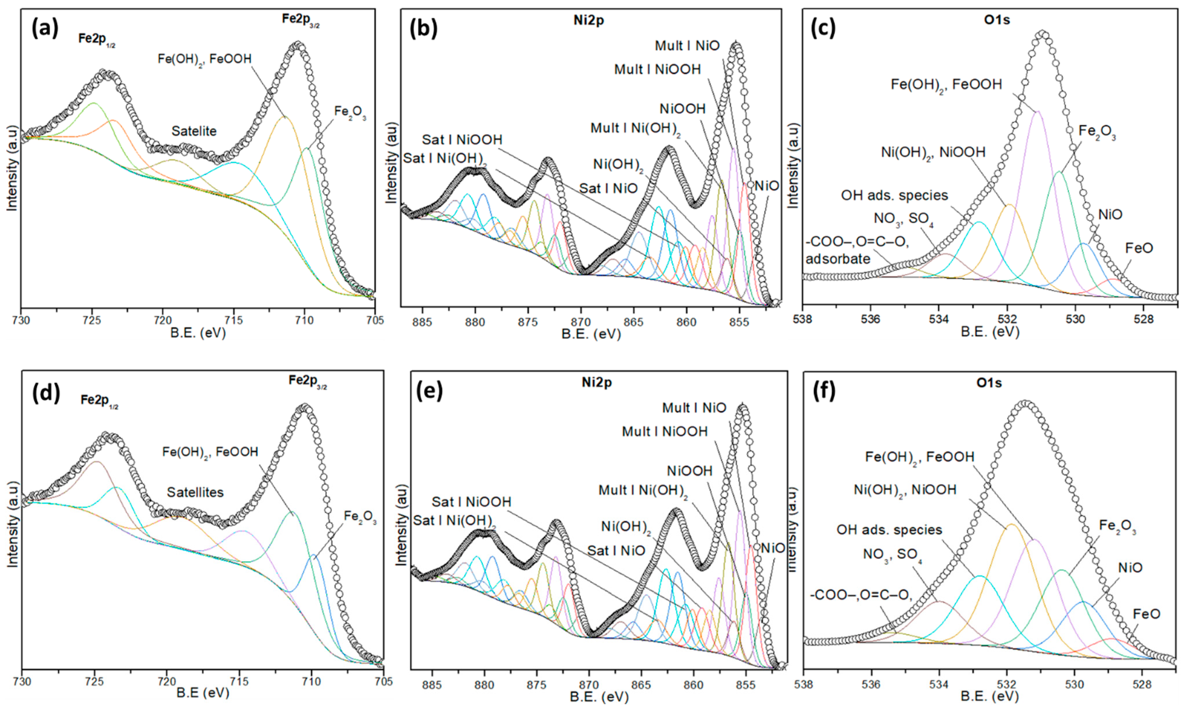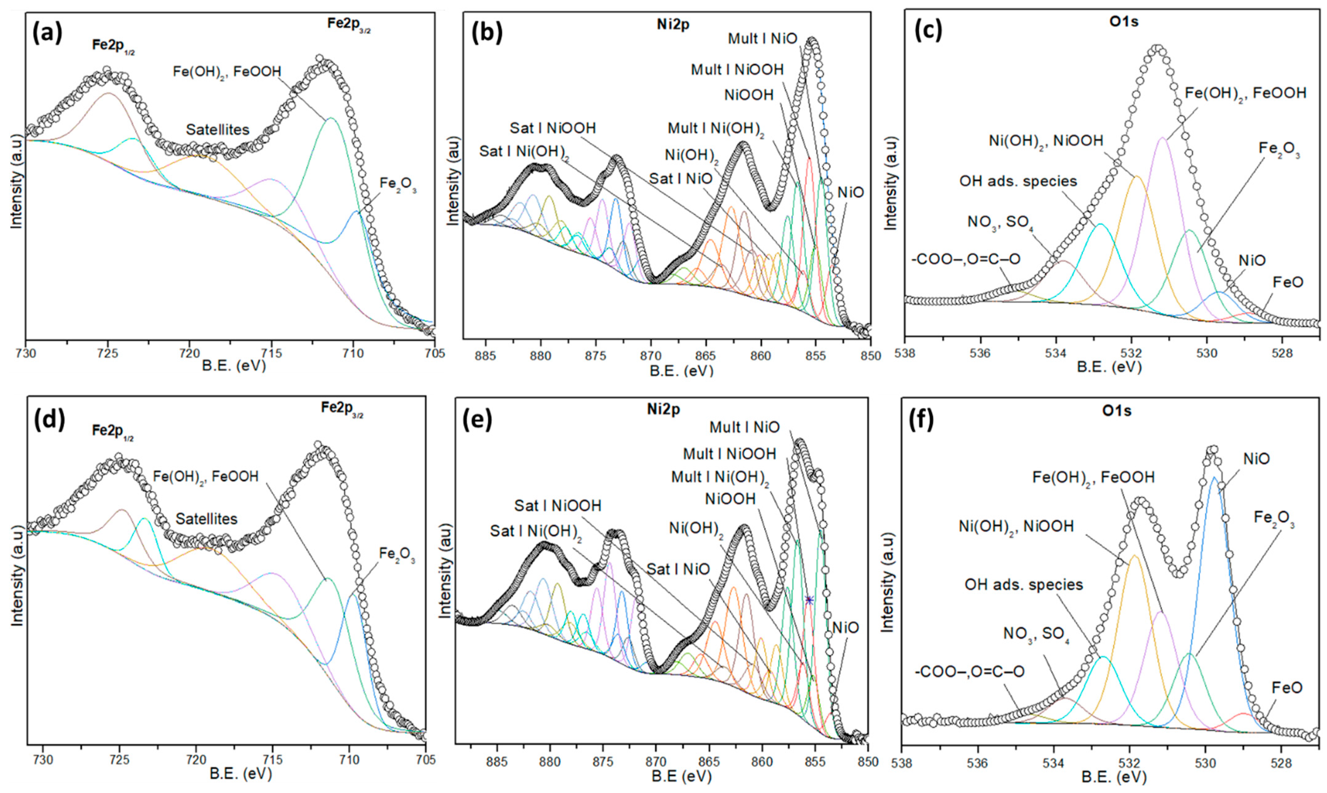 - Biesinger, M.C.; Payne, B.P.; Grosvenor, A.P.; Lau, L.W.; Gerson, A.R.; Smart, R.S.C. Resolving surface chemical states in XPS analysis of first row transition metals, oxides and hydroxides: Cr, Mn, Fe, Co and Ni. Appl. Surf. Sci. 2011, 257, 2717–2730. [Google Scholar] [CrossRef]