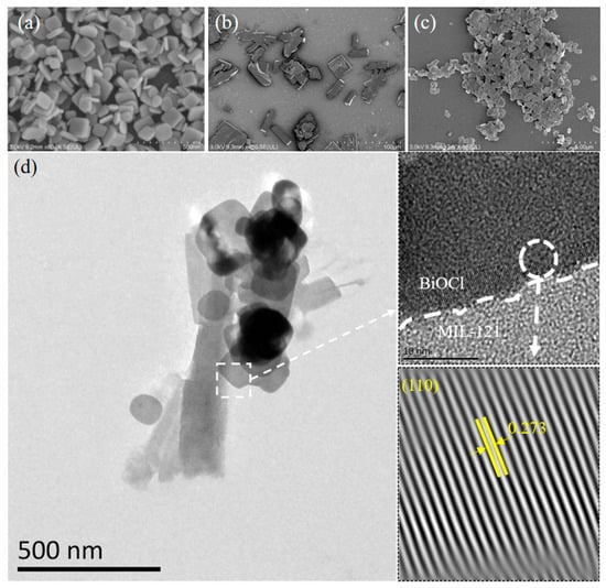 To examine the nanostructural features of the synthesized specimens, scanning electron microscopy (SEM) and transmission electron microscopy (TEM) were employed. Pure BiOCl crystals exhibit a uniform square-shaped three-dimensional nanosheet morphology, the measured lateral dimensions were on the order of 150 nm, with a typical thickness measuring about 20 nm (Figure 1a). As shown in Figure 1b, MIL-121 presents a plate-like structure with a size of about 40 μm. The SEM image of the 5% BiOCl/MIL-121 composite in Figure 1c clearly demonstrates that the incorporation of MIL-121 significantly alters the morphology of BiOCl. The original 3D cuboidal structure of BiOCl transforms into a flattened 2D nanosheet-like morphology, with the lateral dimension extending from 150 nm to 500 nm. Moreover, the previously uniform distribution becomes disrupted and more irregular. These observations suggest that the presence of MIL-121 influences the growth behavior of BiOCl, indirectly confirming the successful formation of the BiOCl/MIL-121 composite. In Figure 1d, HRTEM images clearly reveal that BiOCl grows in situ on MIL-121, A distinct interfacial region between the two components can be observed, indicating the intimate contact achieved during the synthesis process. The lattice fringes with an interplanar spacing of 0.273 nm are assigned to the (110) crystal plane of tetragonal BiOCl (JCPDS No. 06-0249). In contrast, no obvious lattice fringes are detected for MIL-121, which can be attributed to its relatively low crystallinity and the organic–inorganic hybrid framework nature of MOFs [22].