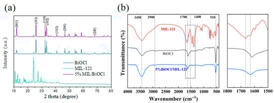 XRD and (a) FT-IR spectra (b) of MIL-121, BiOCl and 5% BiOCl/MIL-121.