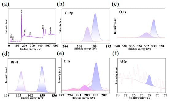 To gain insight into the interfacial interactions within the BiOCl/MIL-121 composite, an XPS analysis was conducted on the 5% BiOCl/MIL-121 sample to determine its surface chemistry. As shown in Figure 3a, 5% BiOCl/MIL-121 contains four elements: Bi, O, Cl, C and Al, which match their chemical compositions. In the Cl 2p spectrum of 5% BiOCl/MIL-121 (Figure 3b), the Cl 2p 3/2 and Cl 2p 1/2 orbitals are identified at binding energies of 198.4 eV and 200.0 eV, respectively. verifying the existence of Cl− in BiOCl. The 5% BiOCl/MIL-121 composite contains O-H bonds and Bi-O bonds within its ligand structure. These chemical species account for the two distinct signals in the O 1s spectrum (Figure 3c), located at 530.1 eV and 532.1 eV, which correspond to lattice oxygen (OL) and OOH, respectively [39]. In Figure 3d, the Bi 4f spectrum of BiOCl displays two distinct peaks centered at 159.7 and 165.0 eV [40], which are assigned to Bi 4f 7/2 and Bi 4f 5/2, respectively [41,42]. In Figure 3e, Deconvolution of the C 1s spectrum reveals three individual components with binding energies of 284.8 eV and 286.2 eV. The main peak corresponds to C=C (sp2), while the other peak could be assigned to C-C (sp3) [39,43]. The latter arises from the abundant carboxylate groups of MIL-121, confirming the preservation of organic linkers upon composite formation. The Al 2p region (Figure 3f) exhibits a pronounced peak at 74.2 eV, characteristic of Al-O coordination, further verifying the structural integrity of MIL-121 [44]. Through the Bi3+-COOH interfacial linkage, an electron-accepting effect is induced, which establishes a direct charge transport channel between BiOCl and MIL-121. This configuration effectively facilitates the dissociation of photogenerated electron-hole pairs in the composite material [45].