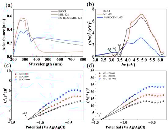 UV–vis DRS (a), bandgap values (b), Mott–Schottky plots of BiOCl (c) and MIL-121 (d).