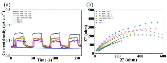 Photocurrent responses curves (a) and EIS (b) of MIL-121, BiOCl, 5% BiOCl/MIL-121, 3% BiOCl/MIL-121, 7% BiOCl/MIL-121 and 10% BiOCl/MIL-121.
