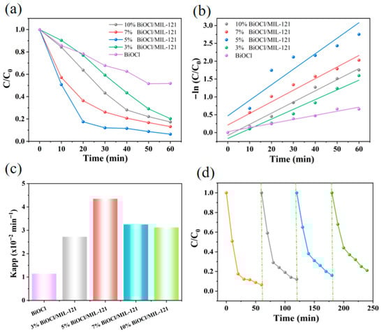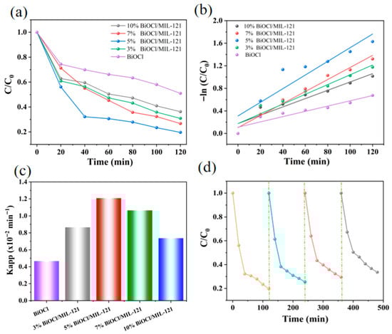 The photocatalytic degradation performances of BiOCl and 3% BiOCl/MIL-121, 5% BiOCl/MIL-121, 7% BiOCl/MIL-121 and 10% BiOCl/MIL-121 composites were systematically evaluated via RhB dye degradation under visible-light irradiation. In this work, the degradation efficiency achieved at 60 min of reaction served as the metric to evaluate and compare the catalytic performance. Following 60 min of catalytic reaction, the degradation efficiency of BiOCl, 3% BiOCl/MIL-121, 5% BiOCl/MIL-121, 7% BiOCl/MIL-121, 10% BiOCl/MIL-121, are 48.2%, 79.8%, 93.7%, 86.9% and 82.7%, respectively (Figure 6a). Notably, the catalytic efficiency of 5% BiOCl/MIL-121 surpasses that of other samples. The k values of BiOCl, 3% BiOCl/MIL-121, 5% BiOCl/MIL-121, 7% BiOCl/MIL-121 and 10% BiOCl/MIL-121 are 0.011 min−1, 0.027 min−1, 0.044 min−1, 0.032 min−1 and 0.031 min−1 (Figure 6b). The maximum k value was observed in the case of 5% BiOCl/MIL-121 (Figure 6c). However, an excessive amount of MIL-121 adversely affects the composite’s light-harvesting ability within the visible spectrum, consequently diminishing its photocatalytic efficiency. As shown in Figure 6d, the catalyst showed a minor efficiency decline after four testing cycles, stemming from progressive material loss that occurs throughout the photocatalytic process. Notably, 5% BiOCl/MIL-121 retained significant catalytic activity, illustrating its comparatively stable catalytic performance. After four cyclic tests, 5% BiOCl/MIL-121 retained 84.3% of its initial catalytic performance, which well demonstrates the good chemical stability of the photocatalyst.