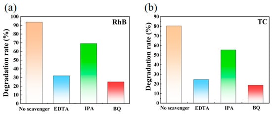 To elucidate the underlying photocatalytic mechanism, a series of radical scavenging tests were conducted using the 5% BiOCl/MIL-121 catalyst for the degradation of RhB (Figure 8a) and TC (Figure 8b). Specifically, 1,4-benzoquinone (BQ), iso-propyl alcohol (IPA) and ethylene diamine tetraacetic acid (EDTA) were chosen as the quenchers for O2•−, •OH and h+, respectively. The introduction of BQ and EDTA caused distinct inhibition of the degradation process, indicating that superoxide radicals and holes function as the dominant active species in the TC photodegradation mediated by BiOCl/MIL-121.