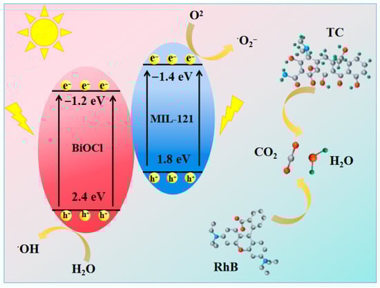 The detailed photocatalytic mechanism is illustrated in Figure 9. Under white-light illumination, MIL-121 serves as a photoactive antenna unit by efficiently harvesting visible photons and enabling the generation of electron-hole pairs. Notably, the holes in the valence band (VB) of MIL-121 exhibit insufficient oxidizing capacity to generate radicals •OH (E(H2O/•OH) = +2.38 eV), as experimentally observed [57]. Because MIL-121 possesses a conduction band edge that is more positive than that of BiOCl, it drives the photogenerated electron flow toward BiOCl as a favored direction. The migration of electrons leads to a marked increase in reactive oxygen species (ROS) yield. Electron migration to the BiOCl surface facilitates the reduction of O2, generating O2•− species (E(O2/O2•−) = −0.33 eV) [58]. The generated O2•− radical actively takes part in the degradation of RhB and TC. Simultaneously, the holes produced in the valence band of MIL-121 retain sufficient potential to directly decompose RhB and TC molecules. The cooperative effect between the components provides a markedly improved separation efficiency for electron-hole pairs, with a consequential enhancement in O2•− radical production. These combined effects allow the 5% BiOCl/MIL-121 catalyst to maintain continuous decomposition of RhB and TC molecules. The underlying reaction pathway can be summarized by the following processes: