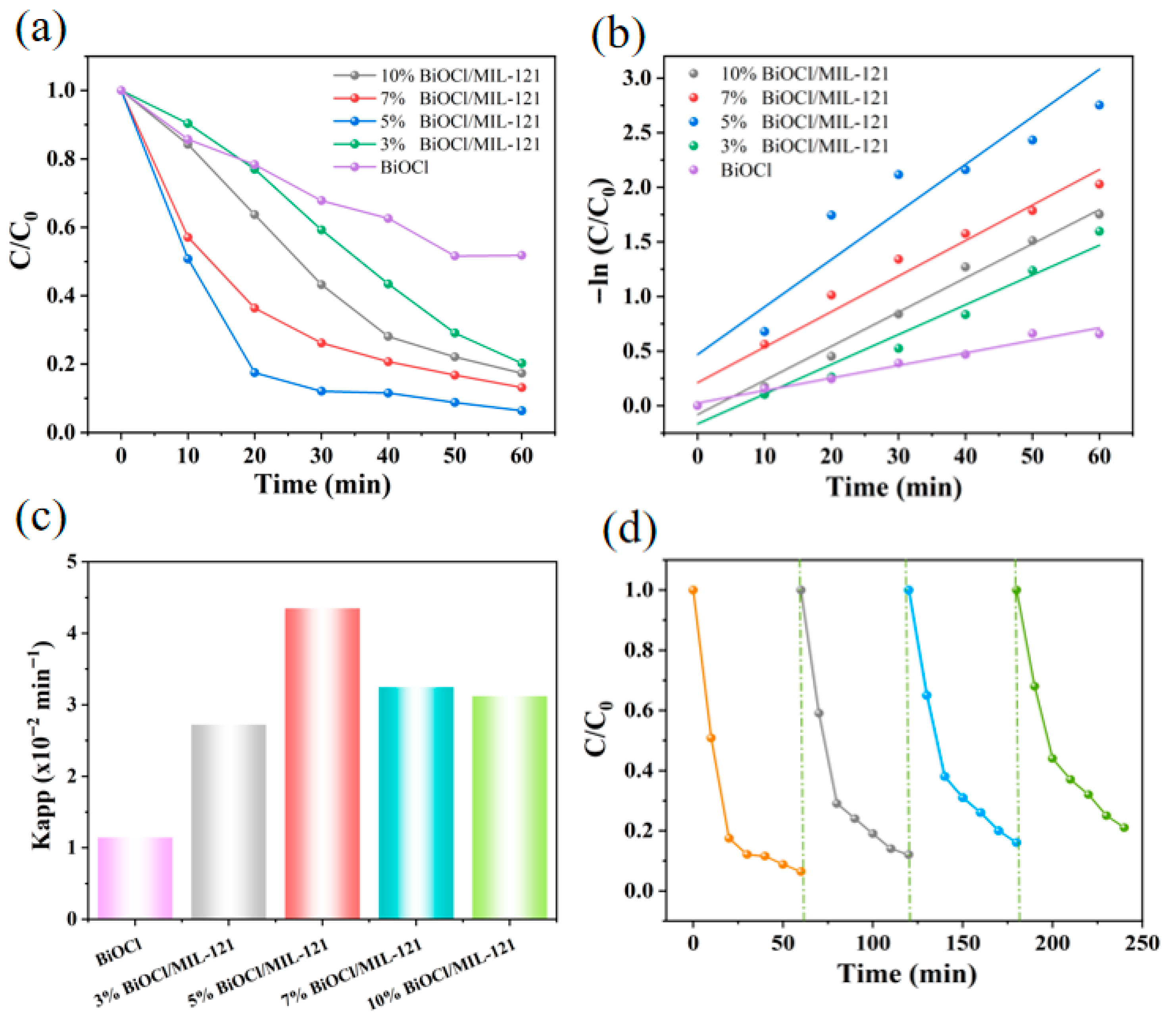 APA StyleXu, T., Chen, J., Ma, Y., Pan, Y., Huang, H., & Wu, G. (2025). Construction of BiOCl/MIL-121 Composites for Efficient Photodegradation of Organic Pollutants Under Visible Light Irradiation. Catalysts, 15(10), 995. https://doi.org/10.3390/catal15100995