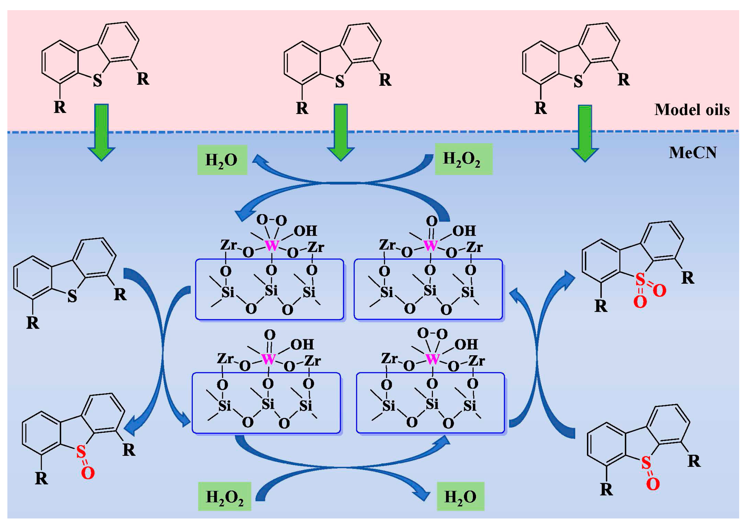 - Xun, S.; Hou, C.; Li, H.; He, M.; Ma, R.; Zhang, M.; Zhu, W.; Li, H. Synthesis of WO3/mesoporous ZrO2 catalyst as a high-efficiency catalyst for catalytic oxidation of dibenzothiophene in diesel. J. Mater. Sci. 2018, 53, 15927–15938. [Google Scholar] [CrossRef]