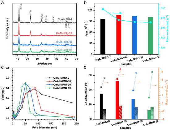 To investigate the influence of pore size distribution on mass transfer, we employed the aerobic oxidation of BA as a probe reaction and measured the catalytic reaction rates of all samples at a low conversion. As shown in Figure 1d, the CoAl-MMO-10 sample displayed the highest BA conversion, about 4.2 times higher than that of the CoAl-MMO-50 sample. Considering that the two catalysts exhibited a nearly identical composition, structure, SBET, and synthesis method, yet exhibited significant differences in catalytic reaction rate, we hypothesized that the reaction rates were determined by mass transfer rate, rather than intrinsic catalytic activity. To verify this hypothesis, we increased the initial BA concentration fourfold, thereby increasing the mass transfer rate and minimizing the influence of mass transfer on the reaction rates. The experimental results showed that the reaction rates of the two catalysts became relatively close (8.7 and 8.0 ·h−1) (Figure 1d). This indicates that BA mass transfer is the limiting factor for the reaction rate at low BA concentrations (the former reaction conditions). Furthermore, after grinding the CoAl-MMO-50 sample to the secondary particle size smaller than 25 μm, the reaction rate incresed to about 13 ·h−1, which should be close to the intrinsic catalytic activity (Figure S3a). Additionally, the reduced O2 pressure condition also led to approximate reaction rates between the two catalysts, which was accompanied by much slower reaction rates and therefore diminished the requirements of mass transfer (Figure S3b). The catalytic performances of other catalysts displayed similar change trends (Figure 1d and Figure S3). These results confirm that BA mass transfer is a decisive factor for the reaction rate. A fully quantitative analysis of diffusion limitations could further substantiate this conclusion and benefit catalyst engineering. However, we reserve such an analysis for future work to maintain a focus on modifying the pore structure of the Co-Al MMO. In brief, the CoAl-MMO-10 sample exhibited the highest catalytic activity mainly due to its higher mass transfer rate, which should be attributed to the optimized pore structure. In contrast, the CoAl-MMO-2 sample presented lower catalytic activity, owing to its underdeveloped pore structure, which featured the least amount of mesopores (Figure 1c).