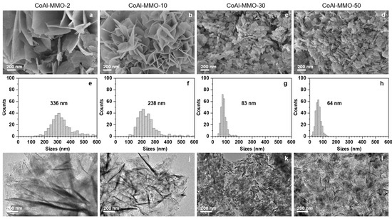 Figure 2 presents the scanning electron microscope (SEM) and transmission electron microscope (TEM) images characterizing the morphology of the Co–Al MMO samples. As shown in Figure 2a–d, all the Co–Al MMO samples exhibit a well-defined porous structure consisting of stacked lamellar flakes, which is typical feature of LDH-derived MMO materials. Figure 2a–d demonstrate a significant progressive reduction in stacking pore dimensions, consistent with BJH analysis results (Figure 1c). Moreover, the mean lateral sizes of the lamellar flakes gradually decrease from 336 to 64 nm when increasing the precursor flow rate from 2 to 50 mL·min−1 during coprecipitation (Figure 2e–h). This illustrates that the lateral crystal dimensions of LDH flakes are inversely related with the precursor feed rates, since the lamellar morphology of MMO inherits the LDH crystal flakes. Additionally, the TEM images also show similar change trends (Figure 2i–l). In brief, the lateral sizes of the lamellar MMO flakes are controllable through tuning precursor addition rates in coprecipitation and thereby achieve regulation of the pore size distribution.