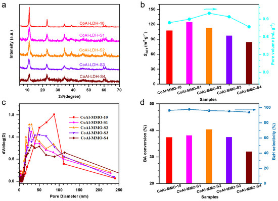 The SBET and pore volumes of the silicate-modified Co–Al MMO samples showed a concentration-dependent correlation with the sodium silicate solution. Samples with lower concentrations (CoAl-MMO-S1 and CoAl-MMO-S2) exhibited higher SBET and pore volumes than the control sample (CoAl-MMO-10), whereas higher-concentration samples (CoAl-MMO-S3 and CoAl-MMO-S4) displayed considerably reduced values (Figure 3b). Furthermore, silicate modification obviously increased mesopore density while reducing the macropore content compared to the control sample (Figure 3c). Except for the CoAl-MMO-S4 sample, the silicate-modified samples exhibited relatively high catalytic reaction rates as compared with the un-modified control sample (CoAl-MMO-10) in aerobic BA oxidation (Figure 3d). Notably, the CoAl-MMO-S2 catalyst, with the highest mesopore content (10–40 nm), achieved the highest catalytic reaction rate (Figure 3c,d). Given that the previous results showed that mass transfer is the determining factor for the catalytic reaction rate, these results illustrate that mesopores significantly influence mass transfer. In other words, the optimized hierarchical pore structure (including mesopores and macropores) of the MMO is beneficial for improving the mass transfer rate and reaction rate. Moreover, the CoAl-MMO-S2 catalyst also demonstrated well catalytic performance for other substrates (Table S1). Additionally, the CoAl-MMO-S4 sample exhibited the lowest catalytic reaction rate, which was primarily due to its reduced pore volume and SBET (Figure 3d).