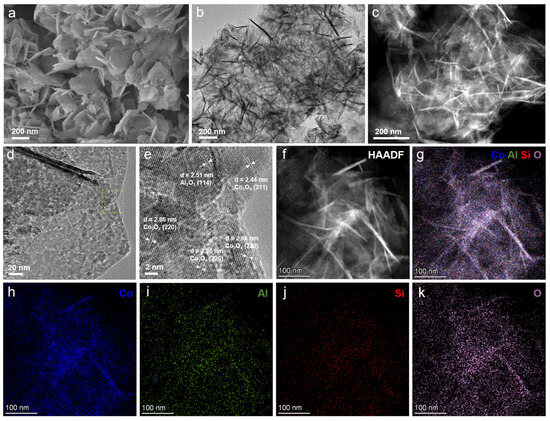 Microscopic characterization of the CoAl-MMO-S2 sample. (a) SEM image, (b) TEM image, (c) HAADF-TEM image, (d) TEM image, (e) high-resolution TEM image (the area marked by the yellow box in d), and (f–k) HAADF-TEM and corresponding EDX mapping images of the CoAl-MMO-S2 sample.