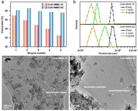 The BA conversion and structural characterization of the un-modified and silicate-modified Co–Al MMO samples over five consecutive reuse cycles. (a) BA conversions; (b) particle size distributions of secondary particles measured by laser diffraction method; (c,d) TEM images of the CoAl-MMO-10 (c) and CoAl-MMO-S2; and (d) samples after a single use, respectively.
